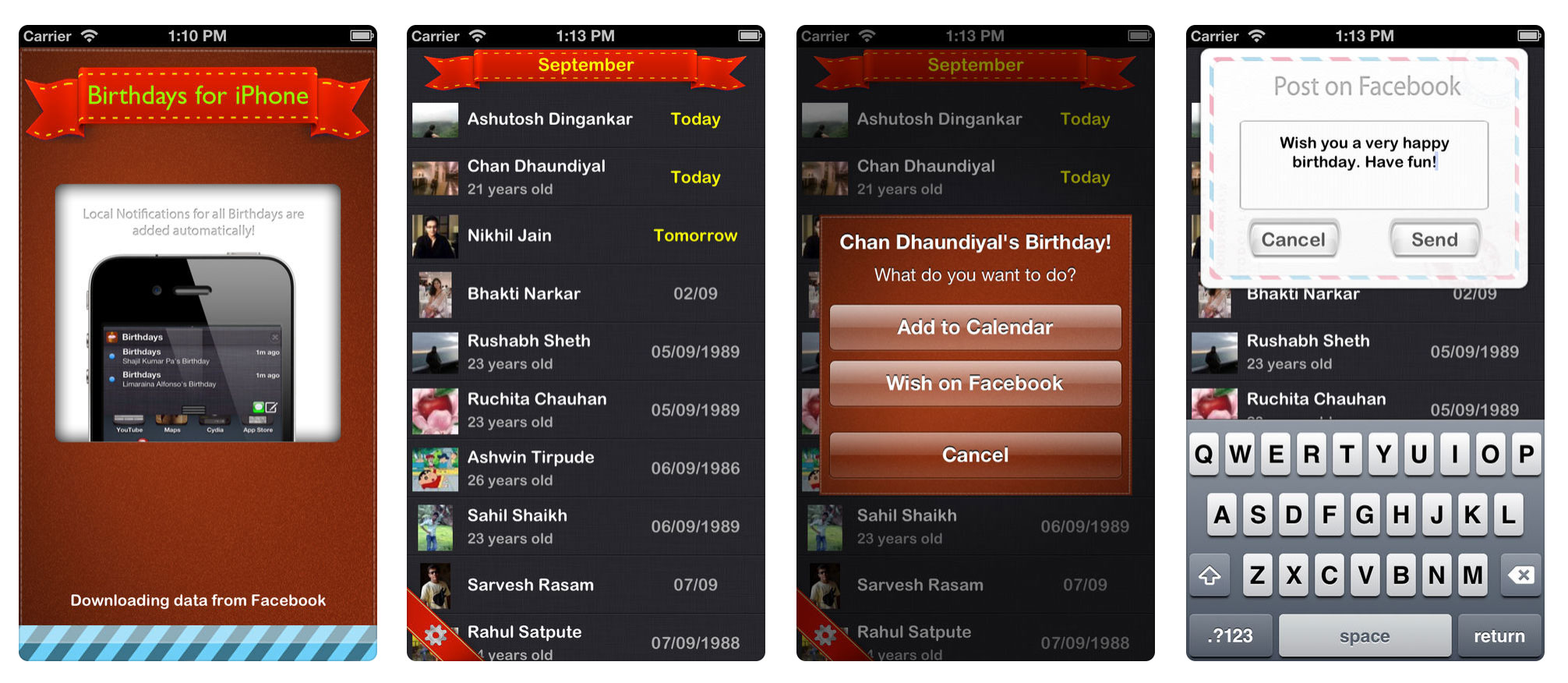- Wish your Friends on Facebook right from the application on the day of their birthday.
