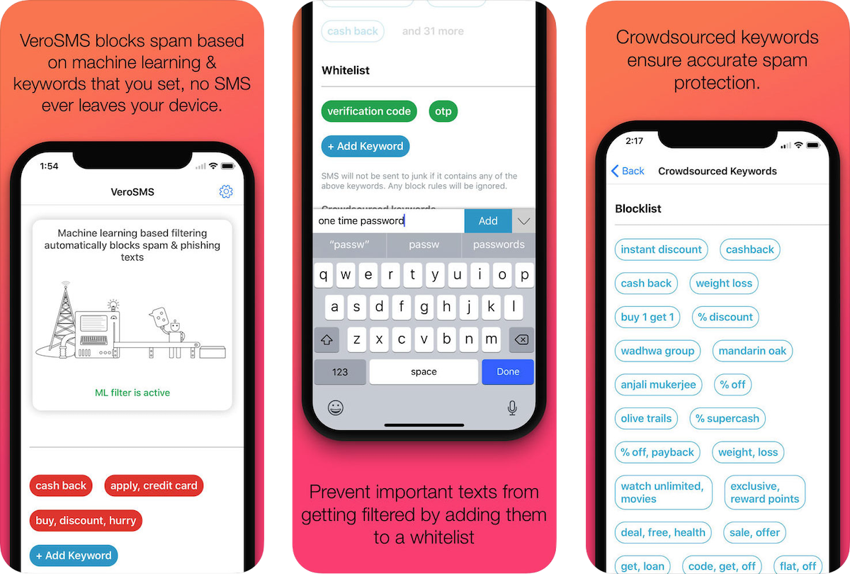 VeroSMS is a SMS Spam filter app focused on maintaining users privacy, it filters spam texts using keywords that you set and using crowdsourced data of keywords that other people in your region set.